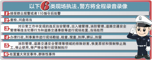 据了解,7月1日起,公安部制定印发的《公安机关现场执法视音频记录工作规定》(下简称《规定》)正式实施。《规定》要求,六类现场执法活动(见右图表)公安机关须视音频记录。