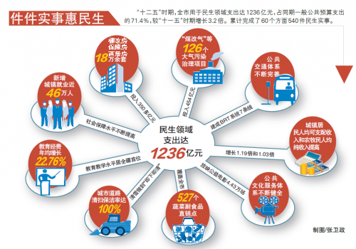 “十二五”时期,乌鲁木齐全市用于民生领域支出达1236 亿元,占同期一般公共预算支出件件实事惠民生的71.4%,较“十一五”时期增长3.2倍。累计完成了60个方面540件民生实事。