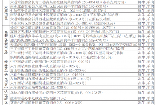 至此,乌鲁木齐市将有71个投放点投放鲜体羊肉、鲜体牛肉、冻体羊肉、冻体牛肉、冻体猪肉精瘦肉、冻体猪肉白条、鲜肉用型鸡肉。(详细地址见表格)