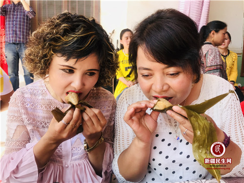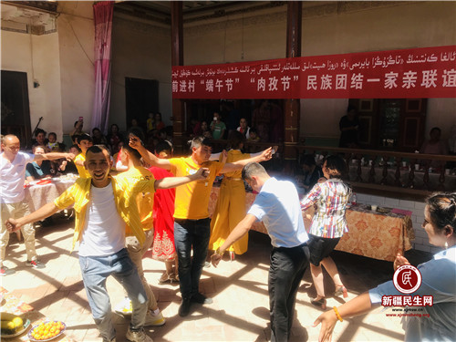 随后,大家前往3组51号农家大院,和聚集在那里的村民共同开展“庆祝双节 民族团结一家亲”联谊活动。100余名干部群众围坐在一起,一边品尝甜糯的粽子、酥脆的馓子,交流各民族的风俗习惯,一边欣赏精彩的文艺节目。欢声笑语在小院里回荡,每个人的脸上笑容真挚而灿烂。虽然语言交流上有些不便,却并不影响干部和群众之间友谊的升温,在共同欢度节日的活动中,大家的情更浓、心更近了。