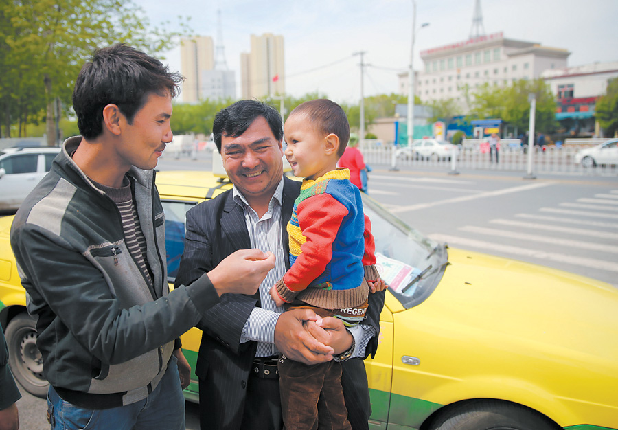 2016年5月5日,3岁的阿不都萨拜尔在小区门口玩耍时走失,阿里木·斯热依丁 (中)将其找到,并送到其父亲面前。(资料图片)