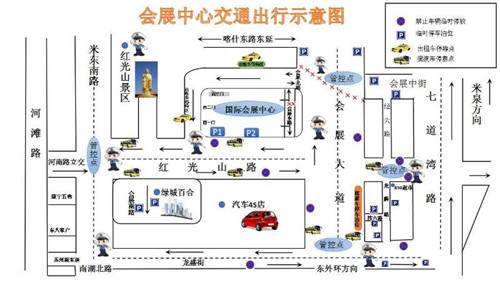 本届博览会期间乌鲁木齐交警将对红光山路会盛巷(绿城百合路口)路口进行封闭,东八家户街、会展南路、会盛巷三条道路畅通,尚德苑小区、绿城百合小区、中天博朗天御小区及周边其他小区的车辆全部从东八家户街进出;绿地中心从龙腾路侧门进出;首府公馆内的车辆在博览会期间从会展大道的侧门出入;希尔顿酒店内的车辆全部从西门出入。