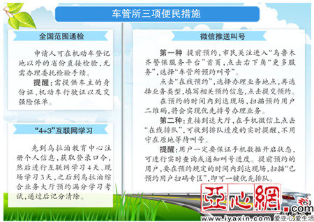 9月3日,记者从乌市公安局交警支队车辆管理所了解到,自9月开始,包括车辆全国通检、驾驶人满分学习程序优化等三项便民措施在首府落地,对驾驶人来说,这意味着,办理车驾管业务又有了新的便利。