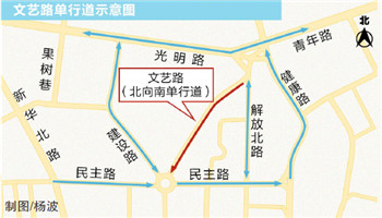 据了解,文艺路恢复北向南单行道通行将从10月1日开始,至10月7日为宣传教育期,10月8日起将对不按规定通行的车辆进行相应处罚。