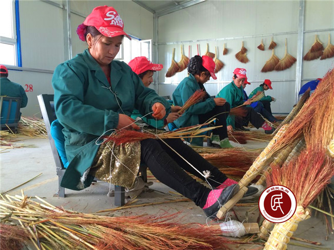 合作社社员正在捆扎扫把