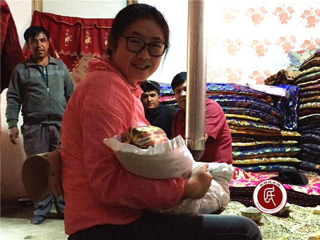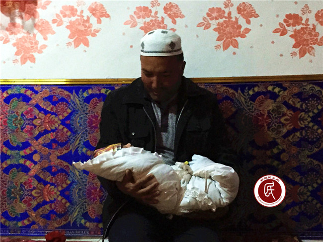 围坐在一起的客人们一个接一个的传递着抱起可爱的小生命,阿利亚憋红的小脸蛋上有着高高的鼻梁,微微张开的眼睛上面用奥斯曼描出了弯弯的浓黑眉毛,俨然一个小美女。大家争相逗着小美女,向孩子说着吉祥祝福的话。最后工作组还为主人家送上了传递喜悦的礼金。