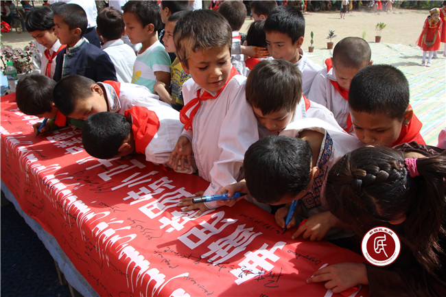 孩子们在“手拉手、心连心、争做民族团结小卫士”的横幅上郑重签名