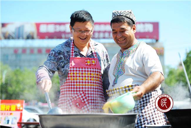 亚中社区工作组组长关向东与“结对子”对象玉素甫同做一锅融情抓饭