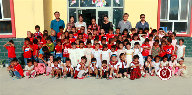 19村工作组成员与19村双语幼儿园的老师和小朋友们合影留念。