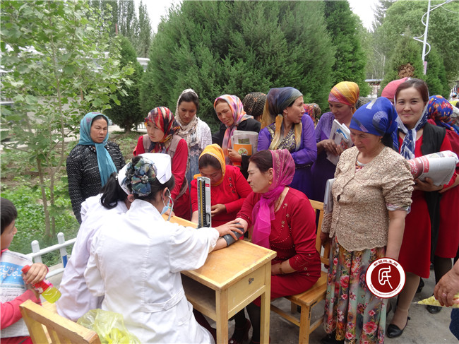 义诊当天,喀什艾日克村委会院内聚满了人,医生们耐心细致地为村民检查身体,热情解答群众提出的健康疑问,针对不同情况,为他们提出符合各自特点的诊疗方法,指导患病村民合理用药,并建议病情严重的村民去医院做深入检查与治疗。
