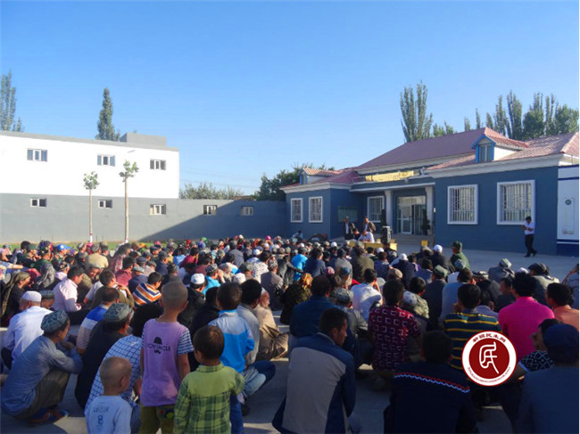 (图为升旗仪式后村支部书记传达张春贤书记的讲话精神)