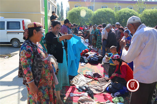 在捐赠活动现场,村民们排着队,依次挑着自己中意的衣服,1200余件衣服、鞋子、包等很快就分完了。民兵努尔艾力拿着一件女士上衣向工作组的女同志征求意见,大家夸他“体贴、心细,懂得心疼老婆”,小伙子的脸刷的一下就红了。舞蹈队员阿吉古丽挑到了一双全新的运动鞋和两件上衣,开心的不得了。