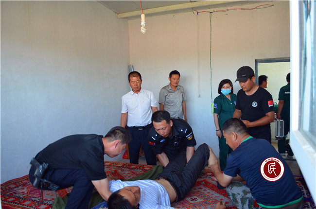 救援现场,大家苦于无法打开宿舍防盗门的时候,村主任助理阿布列力果断破窗而入,在看到失踪厂长还有微弱呼吸和一点意识后,大家都松了一口气。随后,工作组有抢救经验的金涛同志对病人进行简单复苏检查后拿出急救箱里的硝酸甘油片放置于病人舌下和在场的民警对病人四肢反复按摩,党支部书记阿达勒组织人员开窗通风,民警迅速保护现场并立即通知病人家属,协警主动为120车辆开道引路,大家齐心协力为救援赢得了宝贵时间。病人的意识在逐渐恢复,手脚逐渐可以动弹.大家收紧的心也在逐渐放下。