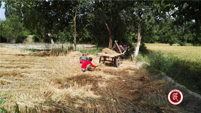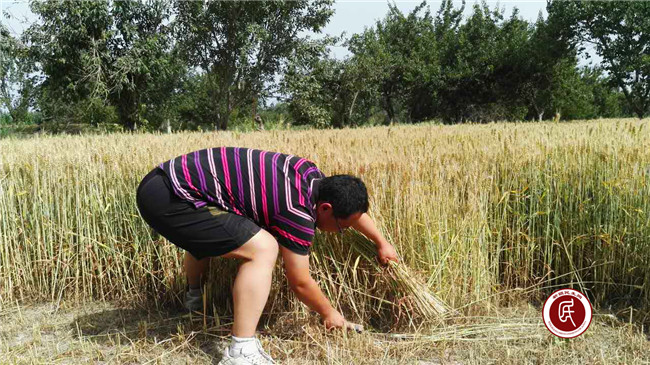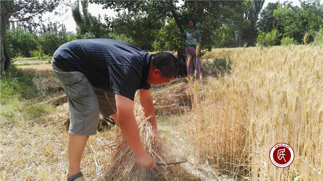 目前,加依村共有各类农业生产土地4600亩,其中麦子约有2000亩,麦收时收割任务时间紧、任务重,因为收割完后还要接着种玉米以及冬小麦。根据地域特点,村里大部分麦田可以用拖拉机机械收割,少部分田地由于区块较小、分布分散,不适宜机械作业,需要人工进行收割。工作组成员、乡干部不畏天气炎热、不惧烈日,积极帮助贫困村民、缺少劳动力的村民收割、捡拾麦子,动作认真,一丝不苟。个个手挥镰刀收割忙,扑下身子干的快,弯腰劳作不怕累,真正体现了住村工作组的真情帮扶和亲民、爱民、惠民的服务意识。