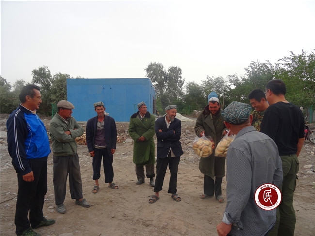 新疆民生网讯 (通讯员 )6月15日下午16时,在总领队努尔卡那提·艾木如拉的带领下克州人社局住喀什艾日克村“访惠聚”工作组全体组员,来到了阿克陶县玉麦乡毛拉湾灌溉渠分水闸口前,为轮到喀什艾日克村义务防洪放水的8名村民带来了生活必需品,及组织的关怀。