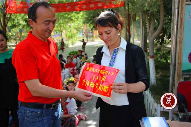回到村里,阿不力克木立即与克依阔小学的校长阿依努尔一同到和田市购买了本子、笔等价值4000元的文体用品。6月2日下午,阿不力克木与工作组的同事带着新疆教育学院实验小学一年级四班全体师生及家长的爱心来到克依阔小学,向广大师生介绍了这次活动的情况,他说:“今天同学们收到的礼物是远在乌鲁木齐的各族小朋友对南疆维吾尔族小朋友的爱心,是民族团结的结晶,虽然乌鲁木齐和和田相隔两千多公里,但是距离阻挡不了爱心的传递,天山再高也阻挡不了手足情谊的传递。希望同学们懂的感恩,就像爱护自己的眼睛一样维护民族团结,努力学习,将来做一名对祖国,对社会有用的人。”四年级的伊曼努尔激动的说:“谢谢乌鲁木齐小伙伴的帮助,我认识阿依图鲁克和阿依提肯,阿不力克木老师经常让我和她们视频聊天,我们是好朋友。”