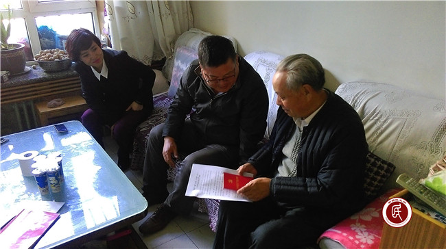昌吉市宁边路街道宁合社区工作组针对辖区内部分年老体弱、行动不便的党员实际情况,以“两学一做”学习教育为引导,到老党员家中开展送党徽、送党章“送学上门”活动。