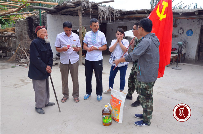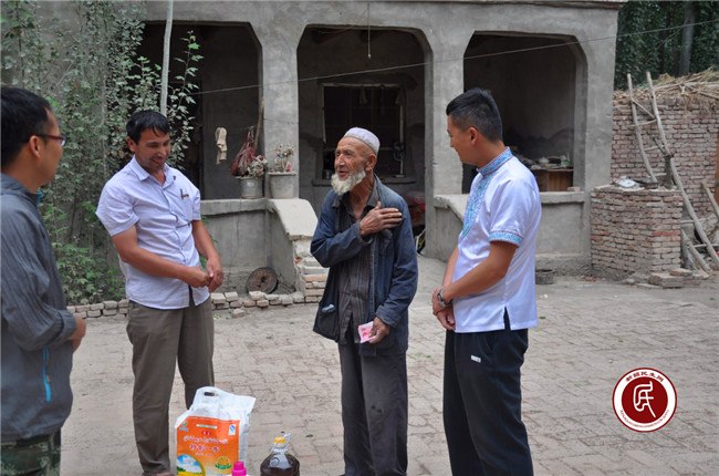 工作组与村干部慰问老党员阿提汗﹒胡达拜地