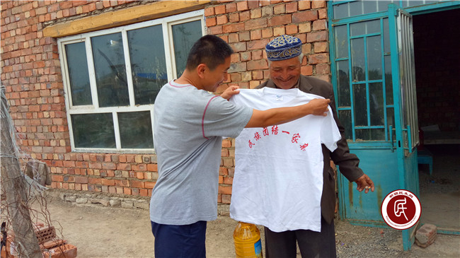 回到村里,工作组顾不上休息,与村两委共同走村入户,对村里2名老党员和2名贫困党员进行走访慰问,为他们送去大米、清油、面粉等生活必需品和印有“民族团结一家亲”的文化衫,鼓励他们继续发挥党员先锋模范带头作用,做民族团结的表率、发展致富的表率、引领道德风尚的表率,争取做一名合格党员,带领村民致富奔小康。困难党员阔克塞根感动的说:“我家里比较困难,工作组经常来看望我,今后我要抓好生产、外出打工,把生活搞上去,给村民带好头。感谢共产党,感谢工作组。”