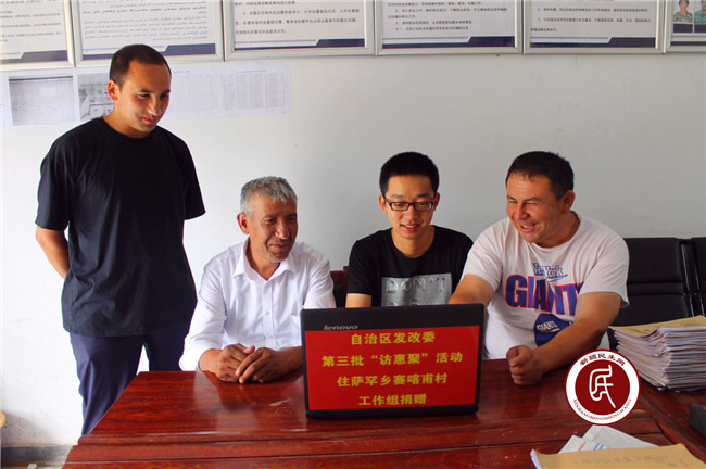新疆民生网讯 (通讯员 朱卫年)正值三夏收获时节,赛喀甫村委会的会议室欢声笑语、掌声阵阵,今天自治区发改委住村工作组将筹集的价值1万元的2台笔记本电脑,一台数码照相机、一台打印机赠送给了村里。