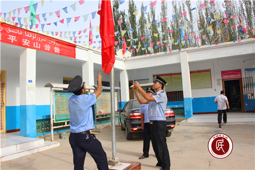 升旗仪式前,工作组、村党员互相整理着装、佩戴党徽。接着,村警、协警组成的护旗队,踏着正步护卫着国旗来到旗杆下,在雄壮的国歌声中,鲜艳的五星红旗徐徐升起,百余名村民排着整齐的队伍,行着注目礼,完成了庄严而隆重的升国旗仪式。工作组副组长阿不力克木·木加帕尔为村民们介绍了中国共产党的发展历程,并号召村民们在村党支部的正确领导下,将巴什克依阔村建设成平安稳定,团结和谐的村而努力。