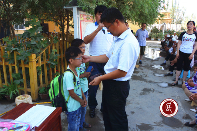 在村民大会上,住村工作组组长李宏琪给双胞胎兄弟戴上了眼镜,兄弟俩一双大眼睛终于亮了,美好的世界清晰展现在眼前,他们露出了开心的笑容。随后工作组还为孩子们赠送了书包,希望兄弟俩能够努力学习,快乐的成长。孩子是祖国的花朵,工作组一直重视并关爱着村里的孩子们,他们承载着阿热兰干村的未来,希望孩子们能够成长为爱国爱疆,懂得感恩的好少年。