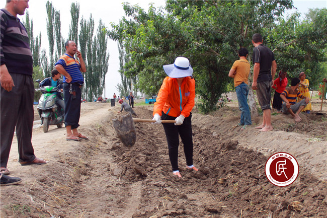 图:工作组成员热娜正在挖出种植西瓜的地埂