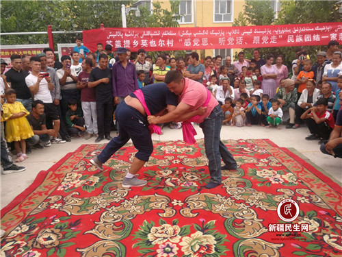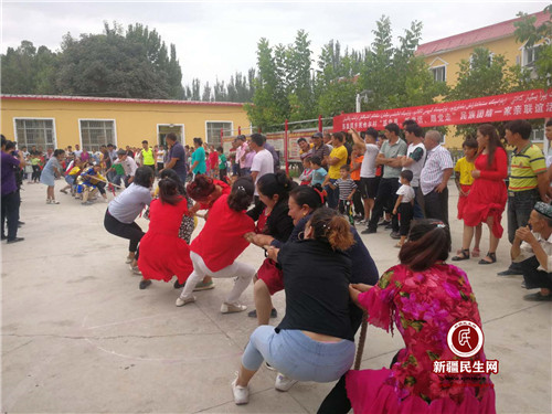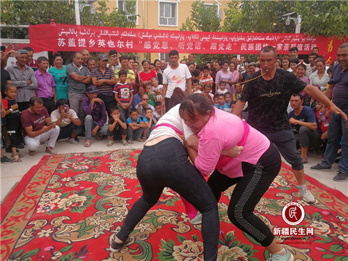 新疆民生网(杜建武、路桂)8月11日上午,自治区交通运输厅、新疆交通职业技术学院、英吉沙县教育与科学技术局驻英吉沙县苏盖提乡英也尔村工作队在古尔邦节来临之际,组织驻村队员、当地村民群众共同开展了精彩的拔河比赛、男子女子组摔跤比赛、才艺展示、口才大PK、歌舞表演等多姿多彩、寓教于乐的民族团结一家亲联谊活动。